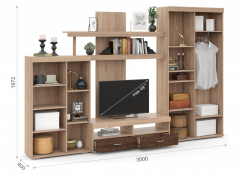 Несмотря на то, что декор фасадов - это новая коллекция, использование корпуса в популярном цвете дуб сонома дает возможность легко сочетать эту стенку в гостинной с другими предметами мебели – столами, журнальными столиками, стеллажами или комодами.