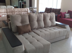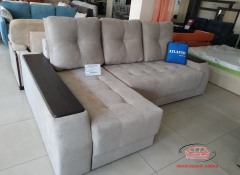Угловой диван с декорированными подлокотниками. С двух сторон открывающиеся деревянные накладки с нишами для хранения. Два больших бельевых короба.